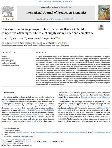 创管学院研究生史睿天在IJPE发表研究论文,揭示负责任AI如何塑造企业的竞争优势